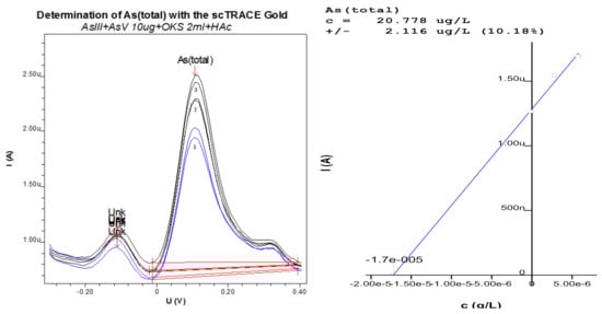 For arsenic speciation in water, HPLC-ICP-MS [22], capillary electrophoresis coupled to UV [23] or MS [24] and surface-enhanced Raman spectroscopy [25,26] are routinely used. Electrochemical methods were also found to be convenient and reliable for arsenic detection [27,28,29,30,31]. Total inorganic arsenic content analysis is normally based on converting all arsenic species into the trivalent arsenic form, which is then determined by electrochemical techniques, while As(V) is electro inactive [7]. The anodic stripping voltammetry (ASV) is very sensitive and suitable for analysis of inorganic arsenic ions in water at ppb levels [31].