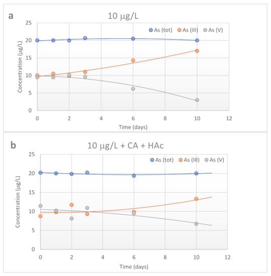 The redox species distribution remained unchanged for 3 days in double-distilled water without preservatives (Figure 3a). However, with the addition of preservatives, the stability time was increased to 5 days and longer. For example, the addition of CA/HAc mixture (Figure 3b) prolonged the solution’s stability up to 6 days. After that period, the reduction of As(V) occurs and the increase of As(III) concentration was the same as in unpreserved sample.