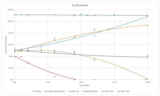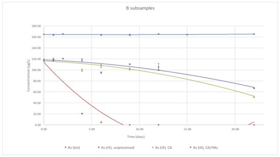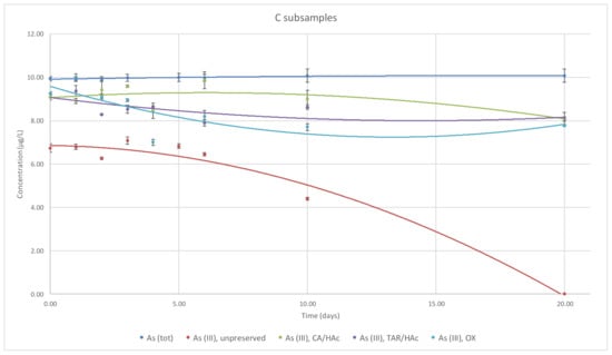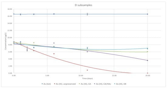 In samples collected in Zagreb county, which is not in the Pannonian Basin, lower As concentrations were determined. In all four samples, the As redox stability was substantially improved by preservation with CA and acidification with HAc, as well as with addition of tartrate and oxalate. In samples C and D, little difference between the treated and untreated subsamples during the first five days was noticed, as can be seen in Figure 6 and Figure 7.