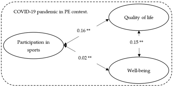 Additionally, the correlation analyzed effects of all variables as presented in Table 3. As shown in Table 3, participation in sports was positively related to well-being (r = 0.02, p < 0.01), and was positively related to quality of life (r = 0.16, p < 0.01). In addition, well-being was positively related to quality of life (r = 0.15, p < 0.01). The results showed variables of participation in sports were significant effect correlations. In addition, well-being was positively related to quality of life and there were significant correlations. Given these results, the impact of the COVID-19 pandemic on the participation in sports and on well-being and quality of life were significant, supporting our hypothesis H1 expectations (showed in Figure 4).
