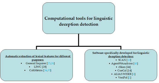 Schematic overview of the main computational tools for linguistic deception detection [2,4,10,14,25,26,28,34,35,43,44].