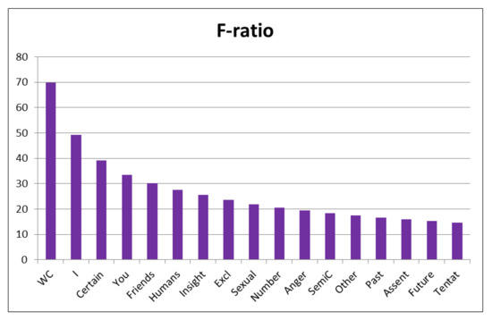 First, the DFA shows a successful discrimination between truthful and untruthful accounts in the general corpus (Wilks’ λ = 0.699, χ2 = 210.7, p = 00.000). Specifically, text length proves to be the best single predictor, as shown in Table 1 and Figure 3. Remarkably, the difference between this predictor and the next one in importance is 20 points. Despite this fact, the F-ratio for the next predictor, 1st person singular, is still rather high. There are some other variables identified as predictors shared with studies for English such as [15], namely 2nd person, friendship, insight, exclusive words, and 3rd person. The remaining predictors are words related to certainty, humans, sexuality, number, anger, semicolon, past, assent, future, and tentative words.