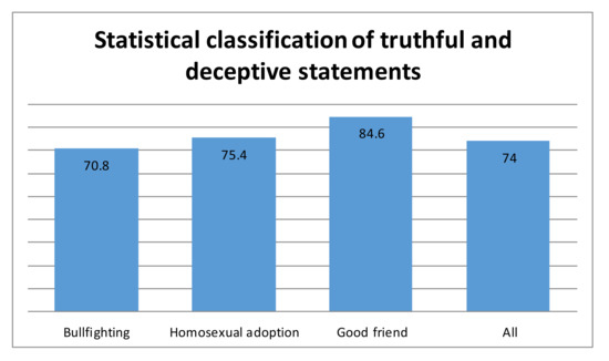 Ref. [22] predates the experiment reported here. As stated above, in that study, Almela et al. (2013) conducted a classification experiment, testing the Spanish version of LIWC2001 [30] to classify a corpus similar to that of [15], trained and tested with a support vector machine (SVM) classifier, using the four dimensions of LIWC (standard linguistic dimensions, psychological constructs, general descriptors, and personal concerns) separately and then with the possible combinations of the four dimensions. The authors showed the relatively high performance of the automatic classifier in Spanish written texts through the experiments, conducted on three subcorpora, checking the discriminant power of the variables as to their truth condition, the two first dimensions, linguistic and psychological processes, being the most relevant ones. Specifically, the best performing combinations across all LIWC tests and topics was an F-measure of 84.5%, using the combination of all four categories on the good friend topic. For comparison with the other LIWC studies that use F-measure, the highest F-measure reported in [1] was 76.9%, using the LIWC features alone on the more lexically constrained hotel reviews, and in [18], it was 79.6%. In [22], the authors state that the higher performance on the good friend topic shows the strong dependence of the task on the topic and attribute the better performance on this topic to the greater emotional involvement that narrators have in describing their best friend.