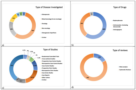 Overview of the study characteristics: (a) type of the disease analyzed in the reviews included in the study; (b) type of drugs analyzed in the reviews included in the study; (c) type of studies analyzed in the reviews included in the study; (d) type of reviews included in the study.
