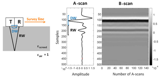 The most dominant wave-type in an A-scan is the direct wave (DW), which travels the shortest path between T and R and is therefore recorded first. As shown, it is a superposition of an air and a ground wave and is generally used as a time reference for the following RW, since the moment of emitting the pulse (time zero) is unknown [21].