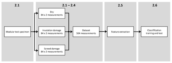Figure 2 shows the general procedure of the work presented in this section. After introducing the designed modular test specimen in Section 2.1, the conducted experiments to obtain a dataset of three damage scenarios are discussed in the Section 2.1, Section 2.2, Section 2.3 and Section 2.4. In Section 2.5, various features are extracted to train and test different classifiers, which are shown in Section 2.6.