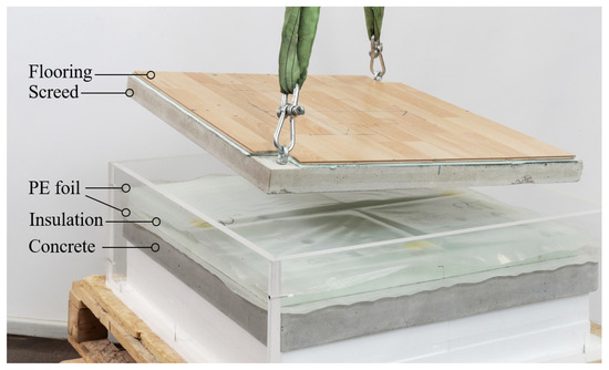 To study multiple different floor constructions, we designed a modular specimen (Figure 3), in which the screed and insulation layer can be exchanged in various ways according to the requirements of the experiment. The inner dimensions of 84 cm length, 84 cm width, and 30 cm height ensure sufficient space for the individual square-shaped parts with an edge length of 80 cm. Table 1 shows the variations of the chosen materials and their thicknesses that are believed to cover most floor setups in practice. Polyethylene (PE) foil is used to create a moisture barrier above and below the insulation. The influence of the laminate flooring and the concrete base layer on the presented classification method is considered to be negligible compared to the screed and insulation layer. Therefore, and with regard to the experimental effort, the flooring and base layer remained unchanged for the entire test series.