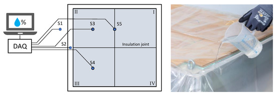 To evaluate the resulting damage of added water, HIH-5030 humidity sensors were embedded in the insulation material, as shown in Figure 4. For EP, XP, and GW, this was accomplished with drilling holes of 3 cm diameter and depths varying from 50% to 75% of the respective insulation thickness. Top sealing was attained with waterproof tape. For the fine-grained PS, drilling holes were not necessary because the sensors could be placed easily.