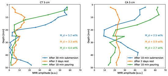 Moisture content above 4 weight percent (wt%) and 0.5 wt% were valued as damage for cement and anhydrite screed, respectively. Due to preliminary investigations of the screed’s hydration process, was already known for each sample. Consequently, the sample’s moisture content could be obtained by measuring only. With 1.7 wt% to 2.3 wt% for CT and around 0.1 wt% for CA, these were rather low before simulating the damage. Therefore, we first flooded each sample by submersing them in water for 30 min (CT) or 10 min (CA). The moisture could then spread and evaporate for at least 2 days before the actual damage was induced. In consideration of practical screed damage that usually occurs after flooding from above, we then constantly poured water on top of the plates for 10 min. Besides continually weighing the samples, additional nuclear magnetic resonance (NMR) measurements were performed with the MOUSE [24,25] to obtain depth-resolved moisture distribution during the described saturation process. Figure 5 presents the exemplary NMR results with their respective water content measured on the 5 cm thick CT and CA screed.