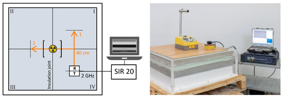 The GPR measurements were carried out with the SIR 20 from GSSI and a 2 GHz antenna pair (bandwidth 1 GHz to 3 GHz) in common-offset configuration. As shown in Figure 6, the ground-coupled antenna pair is moved along two defined 40 cm survey lines that run from quadrant IV to I (1) and along the insulation joint (2). These joints were present for EP, XP, and GW, though not for the fine-grained PS. With 250 scans/meter, each survey line includes 100 A-scans to form one B-scan. An A-scan contains 512 samples covering a 11 ns time window.