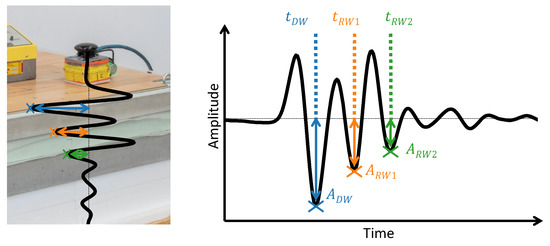 As discussed in Section 1.1 previously, there are several signal features enabling the measurement of water with GPR. Before presenting the ones chosen in this work, it is important to understand the typical signal shapes that occur on layered floor constructions. Figure 7 gives an exemplary A-scan showing three prominent amplitude peaks and their respective origin in the setup. Since the direct wave () partly travels through the superficial ground, it is influenced by the underlying nearest materials, here by the floor cover and the screed. The first reflection arises from the border between screed and insulation and is mostly recognized in the second dominant amplitude peak . After that, shows the second reflection’s amplitude, originating from the insulation-concrete interface below.