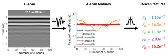 The presented signal features cover all relevant signal parts, with insulation damage mostly influencing the second and first reflection and screed damage causing variations in the first reflection and the direct wave. However, the same features are also influenced by underlying layer thicknesses and different material types. Therefore, another preprocessing step is needed to overcome these construction-specific dependencies, which will be achieved by the B-scan features presented in the following section.