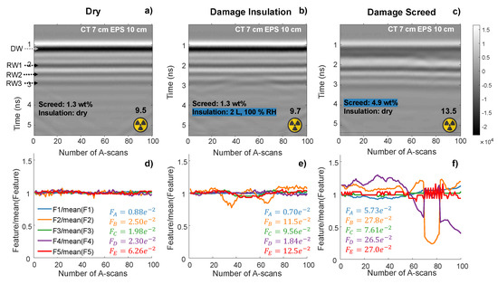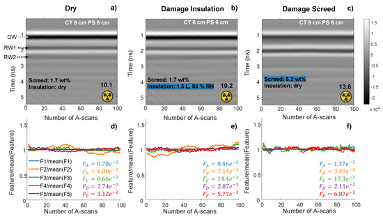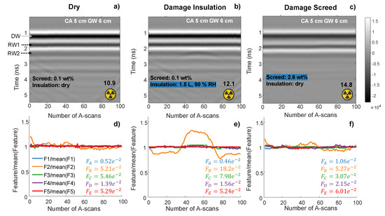 According to the general assumption mentioned in Section 2.5.2, the dry measurement in (a) has a homogeneous reflection pattern, whereas the two damage scenarios in (b) and (c) present clear deviations at specific time-spans. For the insulation damage in (b), we see amplitude changes in the second (RW2) and third (RW3) reflection around 2.5 ns to 3 ns, which come from the affected layer. Water added to EPS usually gathers inside the insulation joints, and from there, it slowly penetrates the material. Therefore, the areas of higher attenuation were located horizontally around the survey line’s center, where the joint is crossed. These deviations become even clearer by considering the respective A-scan feature vector plots below each B-scan. Compared to the relatively flat lines for the dry measurement in (d), () particularly shows significant variations in (e), which is also captured by an increased standard deviation (). These deviations are not immediately recognizable in the B-scan, since the third reflection RW3 shows a more significant variance. Insulation of 10 cm thickness usually developed two reflections, whereby the latter and therefore third reflection was not covered by the used feature set. However, due to their interference, RW2 also experienced a change in amplitude and is therefore suitable for recognizing damage. Since the neutron probe is more sensitive to moisture closer to its radiation source, a small amount of water inside the insulation is not sufficient to cause a significant increase.