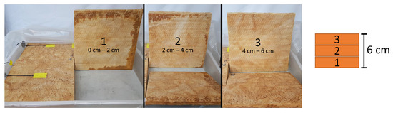 After adding equal amounts of water in all four sides of the setup, the moisture could spread for at least 12 hours to ensure stable conditions. In practical investigations, a threshold of 80% relative humidity is often considered as an adequate reason for renovations, since it provides optimum growth conditions for mould [22]. Following that, a setup was labeled as “damaged” only if all three sensors S3 to S5 exceeded this critical value. Thereafter, the measurement procedure, which is discussed in Section 2.4, was conducted for each of the six screeds.