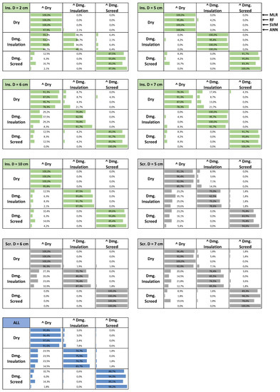 In general, most of the wrong classifications are false-negatives, which are represented by entries left of the main diagonals. Besides the mentioned reasons for damaged insulations, the damaged screed scenario also shows around 5% to 20% of measurements that were classified as dry in nearly every confusion matrix. With regard to the mostly homogeneous reflection patterns shown in Figure 10 and Figure 14, these results are rather satisfying. It shows that even the slight deviations in , and , as discussed in the previous section, are mostly sufficient to recognize the considered screed damages.