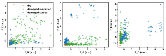 The reasons for these scores become clearer by considering the selected scatter plots in Figure 15 with standardized values. Combining the best-performing, RW2-related features and shows a good separation of the damaged insulation scenario with a broad distribution of possible values. However, due to the discussed appearance of smooth reflection patterns, the damaged screed is mostly indistinguishable from the dry scenario. In this case, features regarding DW and RW1 are obviously more decisive, which can be seen by a better separation in the middle and left scatter plot. However, the separation is not that clear as for the damaged insulation with and , which explains the comparatively lower scores. The blue outliers belong to the 7 cm CT screed shown in Figure 9, where the extra reflector caused an unusually strong deviation in .