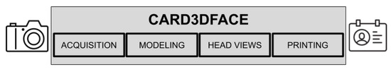 Card3DFace is a system based on four main steps that address the acquisition, modeling, generation of face views and printing phases, as illustrated in Figure 1. The first step seeks to obtain an image of a person’s face based on a single-shot image acquisition. The second phase, modeling, includes two specific steps: the reconstruction and filtering processes. This phase is responsible for transforming the acquired image into a 3D model. The generation of head views corresponds to the third phase, where perspective images of the generated 3D model are obtained and used for printing in lenticular cards, which corresponds to the fourth step.