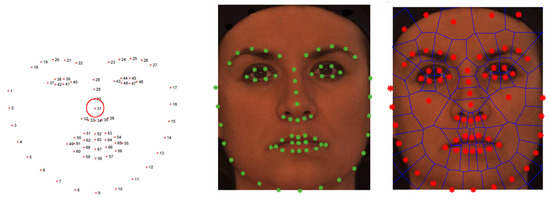 Estimated facial landmarks (left), landmarks on the face (center) and the Voronoi Diagram (right).