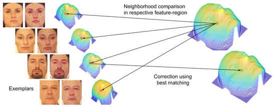 The next step is the correction process, which consists of modifying the points position according to the predictor. For each point , (i) we determine its respective region (), (ii) we obtain its neighborhood and normalize it (with the respective mean and variance), and finally (iii) we apply the projection to the base of the PCA. We use the normalized and reduced neighborhood in the prediction process. The predictor returns the normalized Z-value of the central point according to the best-matching neighborhood. Therefore, we take this value and multiply it by the variance and add it to the average of the neighborhood. The normalization of the exemplar and target neighborhood ensures that we can compare them irrespective of scale (division by variance) and translations in depth (subtraction by the mean). In addition, it is noteworthy that a neighborhood of the exemplar is normalized with its mean and variance, but the process of denormalization is performed by using the mean and variance of the neighborhood of the target that is being corrected. Thus, we transfer the neighborhood feature of the exemplar to the target, with the invariance mentioned above. Figure 7 illustrates this step.