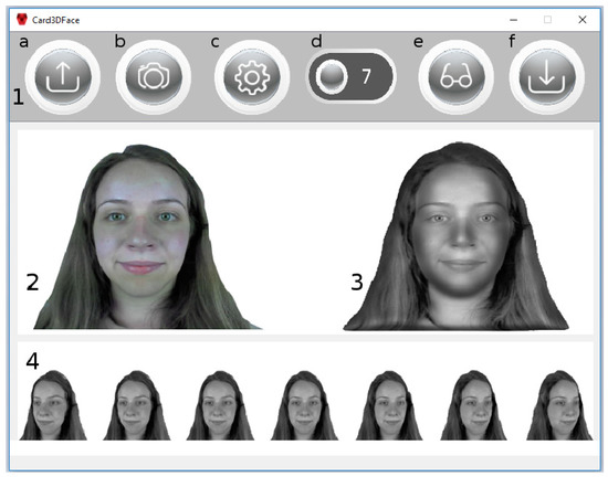 The controls for the application are gathered in a single ribbon at the top. In this command bar, we can select the tasks to perform; namely, uploading from a previously generated model (Figure 9a), camera acquisition (Figure 9b), filtering (Figure 9c), the selection of the number of head views (Figure 9d), the generation of the head views (Figure 9e) and file storage (Figure 9f).