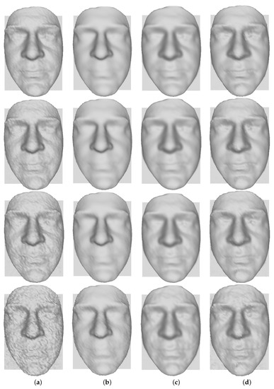Figure 16 exhibits the results obtained by the tested filters. Column (a) illustrates the noisy model ( equals , , and ), while columns (b), (c) and (d) show the models filtered by the Bilateral and Gaussian filters and our filter, respectively.