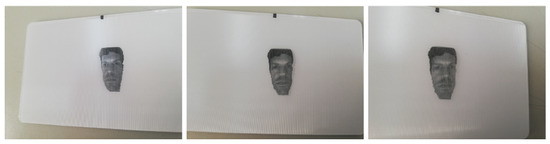 After the acquisition and modeling processes, the generated head view images could be used for printing on the lenticular cards. The calibration of the personalization machine was conducted by expert operators. This process involved the calibration of the exact position of the laser beam reaching the lenticular lenses and the exact calibration of the angle of the card holder with respect to the laser beam. This calibration guaranteed that the generated view images were personalized on the card surface below the lenticular lenses. As this calibration process depends on the specific printer and its inner design, its description does not fall within the scope of this article.