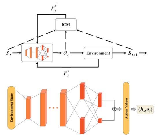 The learning cycle (Top) and schematic illustration of the NDSPI-DQN (bottom). (Top) The agent observes current environment state and outputs an action according to the learned policy; then, the external reward is obtained from the environment. Meanwhile, ICM takes as input and outputs the internal reward . Both and are used to optimize the policy. (Bottom) The details of the algorithm architecture are explained in Section 3.2. The orange layers denote fully connected layers and the red layers denote dueling network architectures with noisy linear layers. The input to the neural network is the vector of environment states, and the output is the action value.