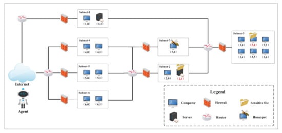 The benchmark scenario for testing different algorithms is shown in Figure 3. To make it more complex and realistic, a honeypot is added to one of the benchmark scenarios in NASim, which is coming from practical commercial experience of []. This scenario has 7 subnets and 17 hosts, among which subnet 2 and 3 are internal networks and subnet 7 is a honeypot. The firewalls restrict the communication between subnets: only a small amount of service traffic is allowed through the firewalls. Each host can be configured with the following properties: address (defined by subnet number and machine number), OS (operating system), host value (measuring the importance of hosts), services (vulnerable software), and process (software that can be used to escalate privilege). Detailed configurations of scenario 1 are presented in Table 1.