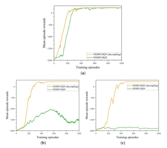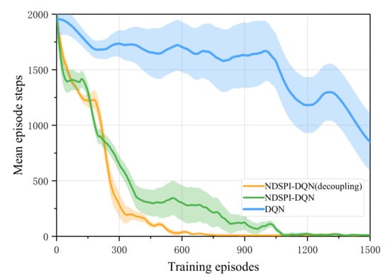 As shown in Figure 4 and Figure 5, at the start of training, the mean reward obtained by the agent is low and the mean episode steps reach the set maximum, indicating that the agent tends to use random policy to choose actions. As the training progresses, the agent gradually learns to use as few steps as possible to obtain the maximum rewards. Finally, both NDSPI-DQN and its decoupling version can converge on the approximate optimal value within limited episodes (∼600 episodes for the decoupling version and ∼1000 for the NDSPI-DQN) while DQN fails to converge during the training process.