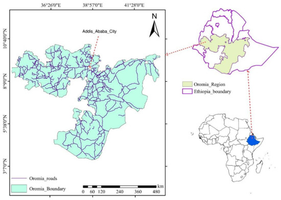 This research was carried out in Ethiopia to identify and prioritize Road Traffic Crash (RTC) hotspot regions, with a particular emphasis on the Oromia region (see Figure 1). RTC data of Ethiopia was obtained from the Ethiopian federal police commission, traffic police division. The commission records crash data for all regions and federal territories. Crash data of four consecutive years (from 2014 to 2017) were used for crash severity analysis and hot spot identification. All collision types acquired from the police commission (i.e., single-vehicle collision, multiple vehicle collision, collision with pedestrians, collision with animals and so on) were utilized for analysis. The Ethiopian Geospatial Information Agency (EGIA) provided a map of Ethiopia divided into regions and federal territories, as well as a map of the Oromia region, divided into zones and towns. In these maps, roadway networks and other important features were included as a shapefile.
