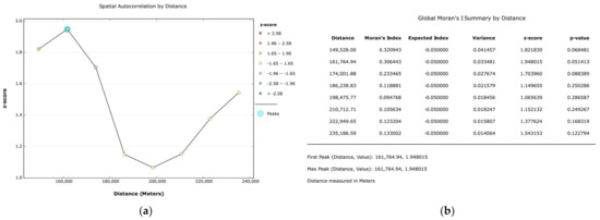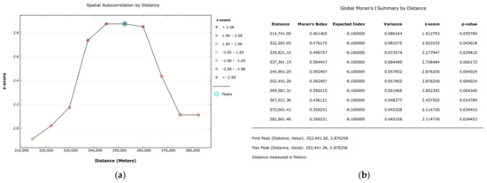 A statistically significant Z-score (peaked) shows a critical distance threshold at which spatial autocorrelations are highly clustered. The first peak was used as the distance threshold in this study because it tends to best describe the spatial variation analysis and is recommended for use when there are multiple peaks [58].
