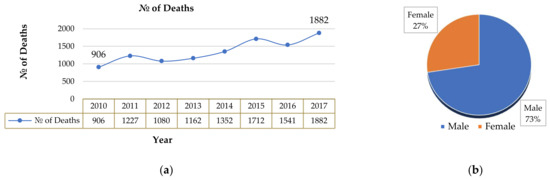 (a) Total lives lost due to RTCs; (b) Percentage deaths (Female versus Male).