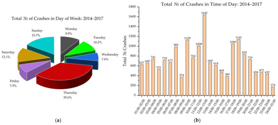 (a) Crashes occurred in a day of the week: from 2014–2017; (b) Crashes occurred in the time of the day: from 2014–2017.