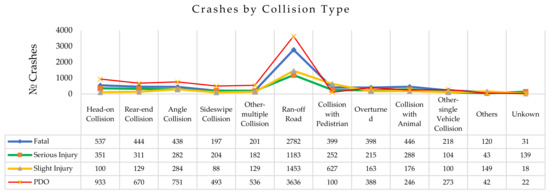 In Oromia, crashes were more likely to occur with a collision type of ‘Ran-Off-Road (ROR)’ see Figure 7. A run-off-road (ROR) collision happens when a moving car overturns on impassable ground or goes out of the roadway and strikes an object. From the critical reasons for ROR collisions, over 95% were driver-related factors [72]. Among the significant driver-related factors that contribute to ROR collisions were the internal problem (i.e., heart attack or other health deficiency), too fast for over-compensation, speeding on curves and sleeping or ‘fatigued driving’, respectively, in a descending manner [72]. However, a thorough investigation into the factors that contribute to the frequency of higher ROR collisions in the Oromia region is needed.