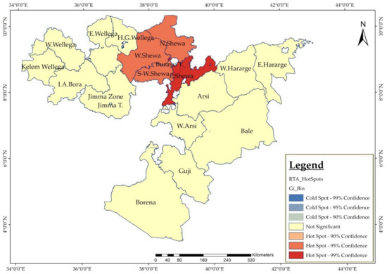 For RTC hot spot identification, spatial analysis using local spatial autocorrelation is preferable. Local Moran’s I is among the well-known local spatial autocorrelation approach used commonly in motor vehicle crash hot spot analysis [53]. However, the family of Moran indices does not differentiate between hot or cold spots. Getis Ord Gi* is, therefore, more appropriate since it distinguishes clusters with high and low feature attribute values among local events. In this study, Getis Ord Gi* statistics method was used to identify RTC hot spots.