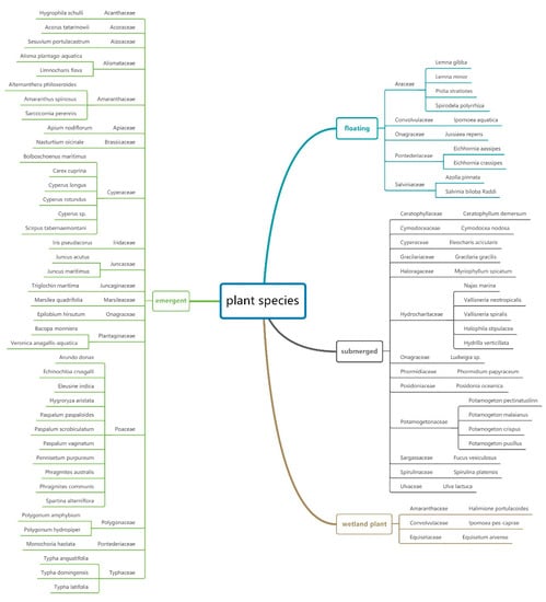 Thus, 30 articles, 18 field experiments, and 12 laboratory simulation experiments, constituting a total of 197 observation groups, were selected. Furthermore, the researched plants, which belonged to 33 families and 74 species, were categorized as floating, submerged, emergent, and wetland plants (Figure 1), to facilitate data analysis.
