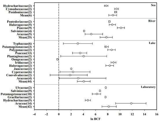 Fifty-three plant species belonging to 19 families (n = 117) that were monitored more than twice in a given study were selected from the database, and their ability to accumulate Hg from water was analyzed. The effect sizes (ln BCF) of the same family plants from the same aquatic habitat were combined to calculate the mean and 95% CI values. The details were inferred from the simplified forest plot shown in Figure 2. The total average effect size of all species was significantly greater than zero (Laboratory: mean = 8.155, CI: 7.042–9.389; Lake: mean = 3.928, CI: 2.935–4.945; River: mean = 7.774, CI: 6.735–8.739; Sea: mean = 8.833, CI: 8.163–9.448). Furthermore, among the 19 families, Araceae in the laboratory showed the highest average effect size (mean = 11.847, CI: 9.277–14.264), whereas Onagraceae in the lake showed the lowest value (mean = −0.219, CI: −0.329–−0.113). Additionally, the average effect size of the other 16 families (Cymodoceacea, Cyperaceae, Gracilariaceae, Haloragaceae, Hydrocharitaceae, Iridaceae, Juncaceae, Plantaginaceae, Poaceae, Polygonaceae, Pontederiaceae, Posidoniaceae, Potamogetonaceae, Salviniaceae, Typhaceae, and Ulvaceae) was significantly greater than zero. Therefore, 17 of the examined plant families were found to significantly absorb Hg from water.