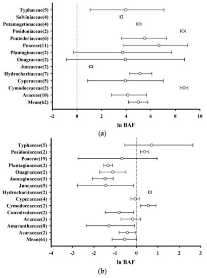 In this analysis, R (ln BAF) represents the ability of plant roots to absorb Hg from the aquatic environment. During the process of plant growth, root exudates (e.g., macromolecular compound iron carriers, complexin, low-molecular-weight compounds, H2CO3, and organic acids) affect the solubility and bioavailability of heavy metal ions, owing to their influence on rhizosphere acidification, precipitation, chelation, and redox reactions []. Furthermore, owing to natural selection, plants that grow in polluted waters show a certain level of tolerance toward heavy metals in the environment. As the plant organ that is primarily responsible for nutrient absorption, the roots play an important role in the absorption and enrichment of heavy metals (Figure 3a). However, numerous heavy metals accumulate in sediments via precipitation and absorption []. Therefore, this analysis can only be used as a reference to compare the Hg uptake ability of different plant roots from the same environment.