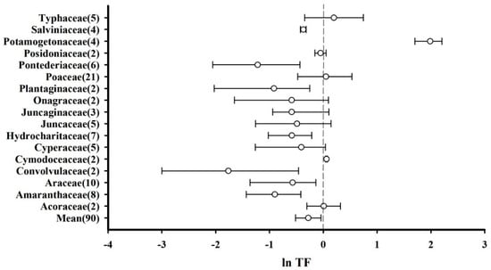 The effect sizes (ln TF) of plants belonging to the same family were combined to calculate mean and 95% CI values. In this regard, 17 plant families were included in the meta-analysis, and a simplified forest plot was drawn (Figure 4). It was observed that the total average effect size considering all the species was less than zero (mean = −0.278, CI: −0.515–−0.043), indicating that for most plants, the roots accumulated more Hg than the aboveground parts. Specifically, the effect sizes corresponding to Cymodoceaceae (mean = 0.061, CI: 0.045–0.077) and Potamogetonaceae (mean = 1.986, CI: 1.704–2.206) were significantly greater than zero, indicating that these plants accumulated more Hg in their aboveground parts relative to their roots. There were no significant differences between the Hg accumulation capacities of the roots and aboveground parts of Acoraceae, Cyperaceae, Juncaginaceae, Juncaceae, Onagraceae, Poaceae, Posidoniaceae, and Typhaceae plants. However, Hg accumulation in the roots of Amaranthaceae, Araceae, Convolvulaceae, Hydrocharitaceae, Plantaginaceae, Pontederiaceae, and Salviniaceae was considerably higher than that in their aboveground parts.