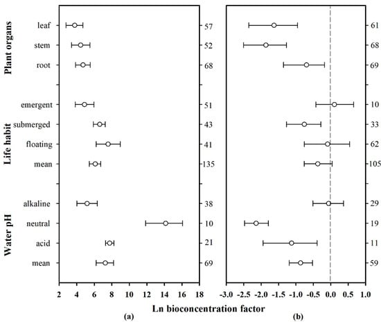 Mean biological concentration factor (BCF) values of Hg in aquatic plants based on pH, life habit, and plant organs. The pH values were classified as follows: acid (<6.5), neutral (6.5–7.5), and alkaline (>7.5). The error bars represent 95% bootstrapped CIs, and the numerals on the right y-axis represent the number of observations in each category. “Mean” indicates the overall effect considering all the observed plant families. (a) Hg absorption by plants from water. (b) Hg absorption by plants from sediments.
