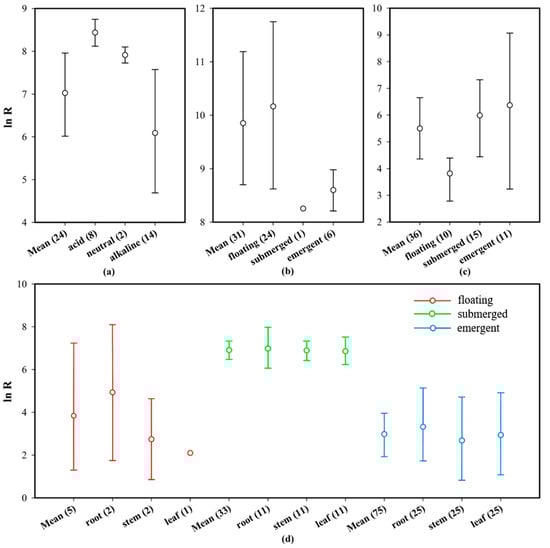 Mean effect sizes (ln R) of Hg concentrations in different life habit plants, and plant organs in terms of pH, and life habits. The error bars represent 95% bootstrapped CIs, and the numerals below the x-axis represent the number of observations in each category. “Mean” indicates the overall effect considering all observed objects in the same category. (a) Effect size of pH on Hg absorption by plant roots; (b) effect size of life habit on Hg absorption by plants in neutral and acidic water (pH < 7.5); (c) effect size of life habit on Hg absorption by plants in alkaline water (pH > 7.5); and (d) effect size of plant organs on Hg absorption by different life habit plants.