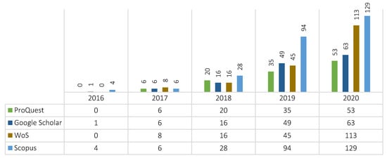 - Limiting the search time frame between 2016 and 2020 to have a consistent a range of results across all databases;