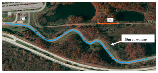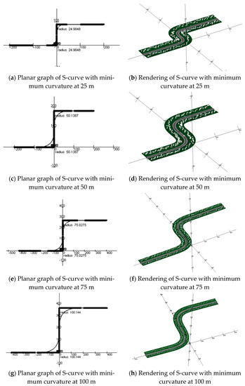 Four S-curve driving scenarios are designed, which are shown in Figure 6. The designs are based on the road shown in Figure 1. All four S-curves are designed with a track transition curve [20] with a minimum curvature of 25 m, 50 m, 75 m, and 100 m. Those curvature designs are based on the speed of the ADB vehicle, calculated by the formula (1) of the curve design guideline provided by the AASHTO Green Book [21].