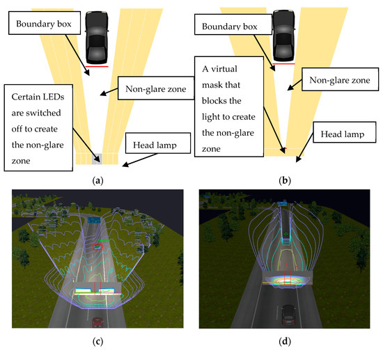 Comparison of pixel masking and matrix beam showing the difference of two simulation algorithms: (a,c) ADB simulation using matrix beam algorithm, in which each segment can be switched on/off individually; (b,d) ADB simulation using pixel-masking algorithm, which uses one beam pattern, with the boundary box of the stimulus vehicle masked out.