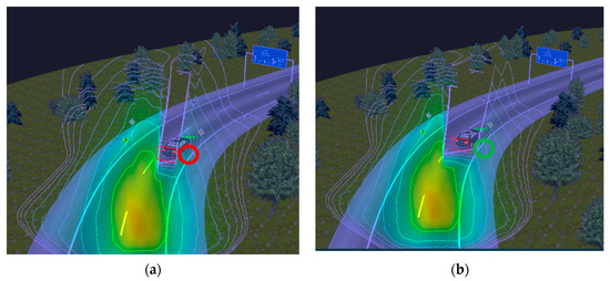 Figure 4 and Figure 5 demonstrate how altering the non-glare zone width would affect glare and road illumination by comparing an ADB with a 100% non-glare zone to one with 150% in the same driving scenario. The width of the non-glare zone is measured as the percentage with respect to the width of the boundary box. A 100% non-glare zone width means it is the same width as the boundary box, which is the narrowest; a 150% non-glare zone width means it widens (equally on both the left and right) to 150% of the boundary box width. In Figure 4a, the rearview mirror, highlighted in the red circle, is not covered by the non-glare zone, and, thus, glare is created. By increasing the non-glare zone width to 150% of the boundary box, shown in Figure 4b, glare is eliminated in the rearview mirror, highlighted in a green circle, indicating a good experience. Meanwhile, in terms of road illumination, with a 100% non-glare zone width, the two circled street signs in Figure 5a are illuminated, while Figure 5b shows that they are not in a widened non-glare zone, indicating worse road illumination. This shows that, although widening the non-glare zone could solve the side rearview mirror’s indirect glare issues, the narrower non-glare zone provides better visibility to the driver, who can observe the surrounding environment and road conditions more effectively. For example, if a deer is standing by the roadside, the ADB system with a narrower non-glare zone will illuminate the deer sooner, giving the driver more reaction time, thus enhancing driving safety. This comparison indicates the importance of defining the best non-glare zone width that balances glare mitigation and driver visibility.