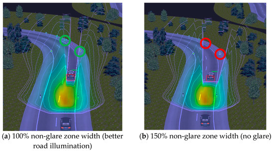 Effect on road illumination when altering the non-glare zone width, showing that a widened non-glare zone sacrifices road illumination. For example, the traffic signs circled on (a) are well illuminated; however, when the non-glare zone increases on (b), the signs are included in the non-glare zone and, thus, are not illuminated. This indicates the driver will have better and wider visibility with the narrower non-glare zone, which enhances driving safety.