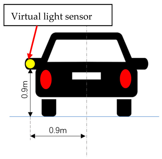 The selection of a stimulus vehicle and sensor position in this research is based on the SAE J3069 [26] ADB test fixture. A Mercedes E W211 vehicle geometry is chosen as the stimulus vehicle, considering that its dimensions are similar to the test fixture. The light sensor is mounted 0.9 m above the ground, 0.9 m away from the center along the y-axis, and 3.5 m away from the rear of the vehicle along the x-axis, representing the position of the driver-side rearview mirror, illustrated in Figure 7.