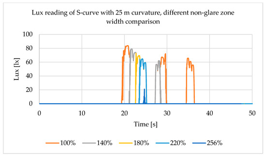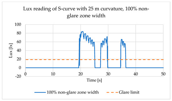 In each driving scenario, the vehicle starts from the left end of the road, then navigates a left turn followed by a right turn and finishes at a straight road. Because the overall length of the road also increases when the curvature increases, the simulation time varies from around one to two minutes. The lux reading of each simulation is logged, and a lux–time graph is plotted. Figure 8 shows the data collected for the narrowest non-glare zone in the first driving scenario in which the minimum curvature is 25 m.