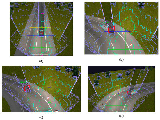 S-curve with 25 m curvature simulation at 100% non-glare zone width: (a) At the beginning of the simulation, the vehicle travels on a straight road, and no glare is created. (b) When the vehicle enters the corner, glare is created, corresponding to the first peak in Figure 8. (c) When the stimulus vehicle exits the high beam area, there is a short time when glare drops to zero, corresponding to the area between two peaks in Figure 8. (d) Light penetrates through the vehicle body due to the limitation of the simulator, which is shown as the third peak in Figure 8 and is neglected as an error.