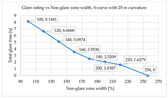 Total glare time vs. non-glare zone width for S-curve with 25 m curvature, showing that the total glare time reduces with increasing non-glare zone width. All glare is eliminated if the non-glare zone widens to 256% of the boundary box width.